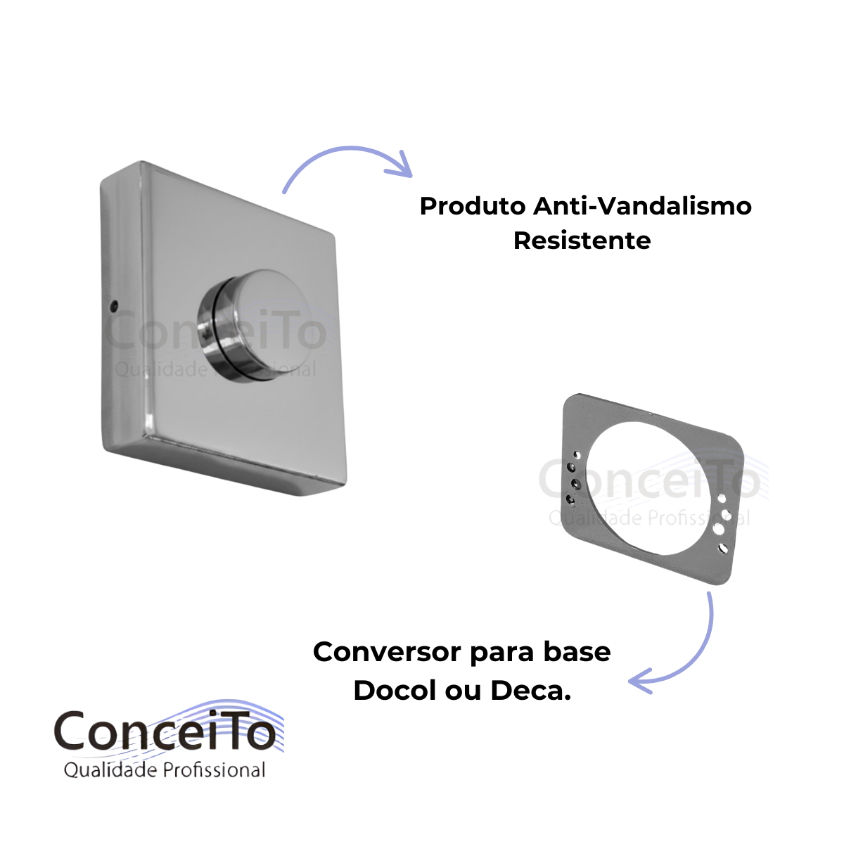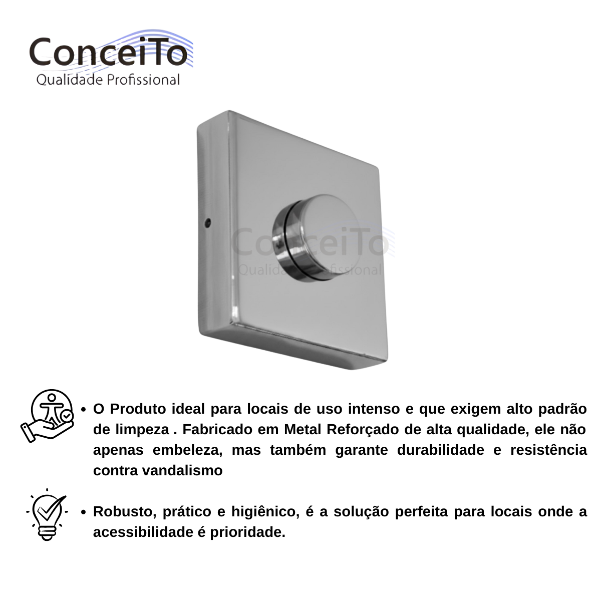 O acabamento da Conceitometais foi desenvolvido especialmente para proporcionar segurança anti-vandalismo e eficiente em ambientes que seguem as normas da ABNT NBR 9050. Indicado para uso em banheiros públicos, hospitais, escolas, clínicas e espaços adaptados, ele permite o acionamento do registro com facilidade, conforto e mínima força.
