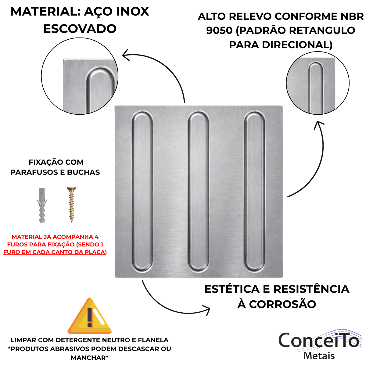 Com superfície em relevo linear no padrão direcional, orienta o trajeto de forma tátil e visual conforme as normas de acessibilidade. Pode ser fixado com parafusos.