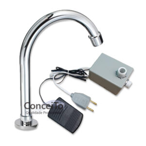 Acionador de pedal resistente e com fácil instalação. Indicado para ambientes que não é permitido o contato manual como consultórios, clínicas, restaurantes, hospitais e laboratórios. Evita o contato manual e contaminação cruzada. Proporciona economia de até 70% de água, acompanha bica.