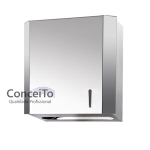 Dispenser de papel toalha ou toalheiro em aço inox, com excelente qualidade e alto luxo com design sofisticado e com estrutura reforçada para ambiente público, com trava de segurança com chave. Indicado para ambientes como, hospitais, consultórios, restaurantes, clínicas, industrias, shoppings, hotéis, vestiários, e para outros ambientes. Com capacidade para 500 folhas de 2 ou 3 dobras, acompanha: